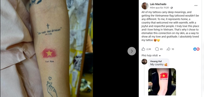 Mới đây, trên trang cá nhân, Lais Machado, bạn gái của tiền vệ Đỗ Hoàng Hên thu hút sự chú ý khi chia sẻ hình ảnh tiền vệ mang áo số 9 ở ĐTQG xăm quốc kỳ Việt Nam lên cánh tay, kèm theo những dòng trạng thái đầy cảm xúc. Cô viết: “Tất cả các hình xăm của mình đều mang ý nghĩa sâu sắc, và việc xăm lá cờ Việt Nam cũng không phải ngoại lệ”.