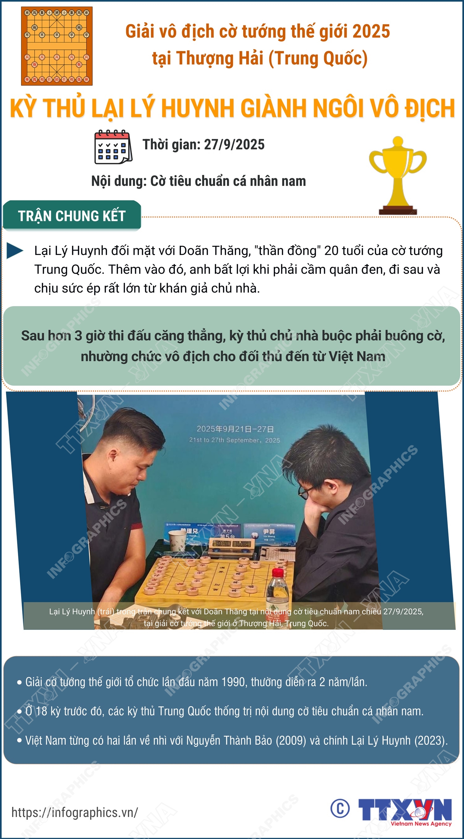 Chiều 27/9/2025 tại Thượng Hải (Trung Quốc), kỳ thủ số 1 Việt Nam Lại Lý Huynh đã đánh bại kỳ thủ người Trung Quốc Doãn Thăng, giành HCV nội dung cờ tiêu chuẩn cá nhân na...