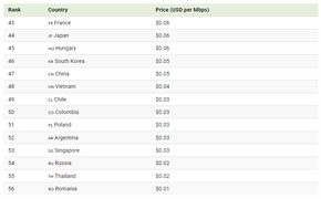 Hoa Kỳ nằm trong nhóm có giá Internet tương đối phải chăng, khoảng 0,08 USD/Mbps, thấp hơn nhiều so với mức trung bình toàn cầu là 0,42 USD/Mbps. Các nền kinh tế lớn khác như Pháp và Nhật Bản cũng có giá thấp hơn mức trung bình, cho thấy các nước phát triển đã đạt sự cân bằng giữa chi phí và chất lượng dịch vụ.