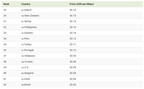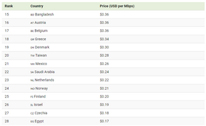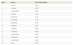 Đứng đầu danh sách là Các Tiểu vương quốc Ả Rập Thống nhất (UAE) với mức giá trung bình 4,31 USD/Mbps, gần gấp đôi Ghana (2,58 USD), quốc gia xếp thứ hai. Nguyên nhân chủ yếu đến từ thiếu cạnh tranh giữa các nhà mạng, hạ tầng viễn thông còn hạn chế, và yếu tố quản lý nhà nước. Ngoài ra, các nước như Thụy Sĩ, Kenya và Maroc cũng nằm trong nhóm có giá cao, đều vượt mốc 1 USD/Mbps.